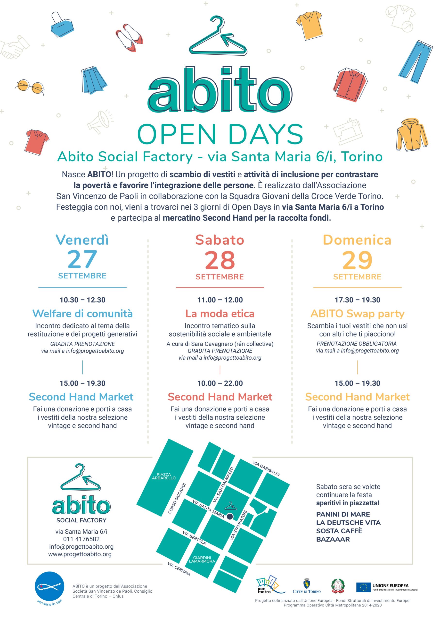 Vi segnaliamo l’evento "ABITO Open Days", promosso dall’Associazione San Vincenzo de Paoli, che si terrà dal 27 al 29 settembre a Torino. L’iniziativa – che rientra nel Programma PON Città Metropolitane 2014-2020 della Città di Torino – sarà l’occasione per conoscere i nuovi locali dell’Associazione che si trovano in via Santa Maria 6/i.