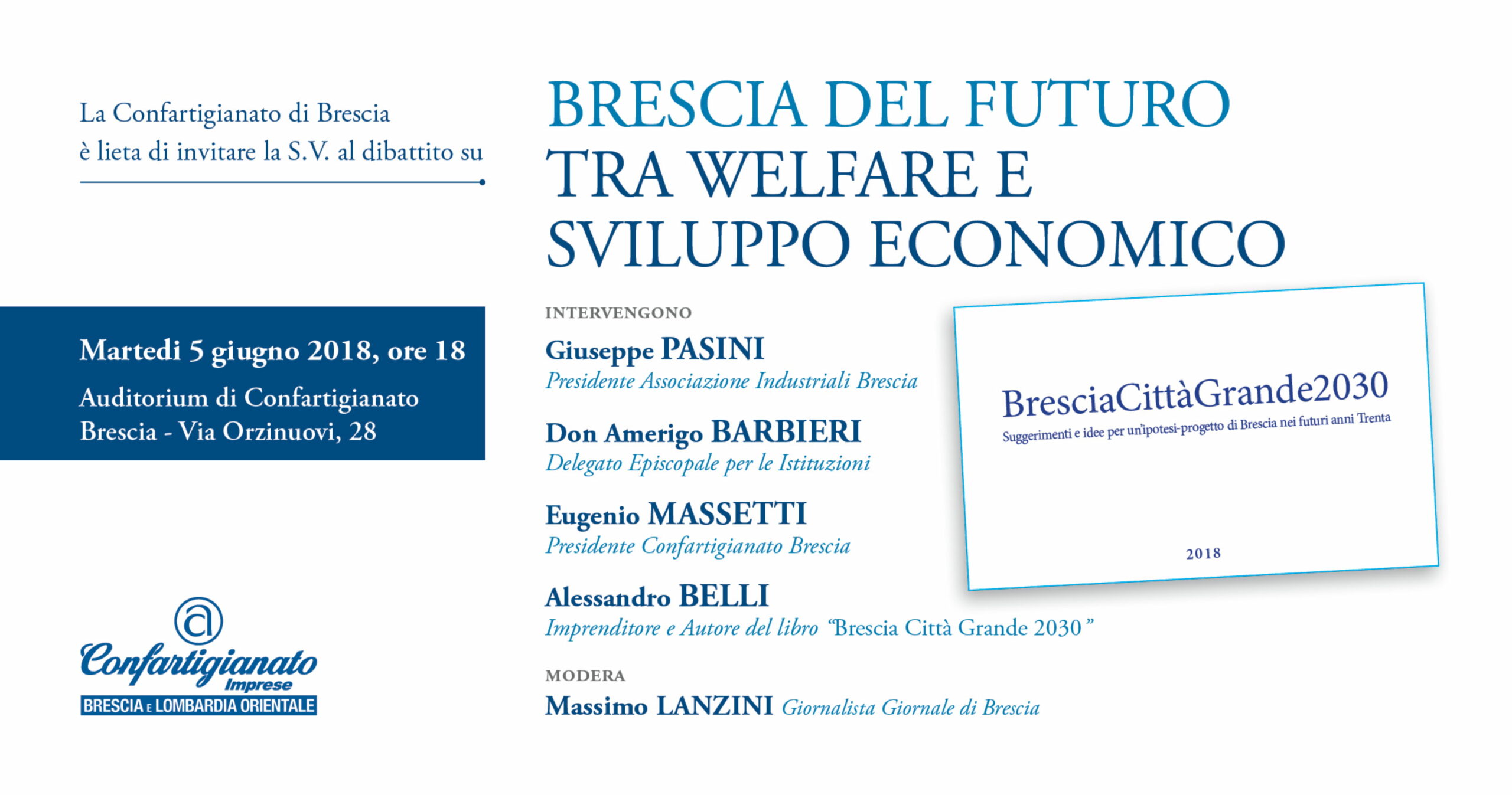L’evento si terrà presso l’Auditorium di Confartigianato di via Orzinuovi 28 a Brescia. Tra i relatori dell’evento ci saranno il presidente di Confartigianato Brescia e Lombardia Eugenio Massetti, il presidente Associazione Industriali Brescia Giuseppe Pasini, il delegato Episcopale per le Istituzioni Don Amerigo Barbieri, l’imprenditore e autore del libro “Brescia Città Grande 2030” Alessandro Belli. Modera Massimo Lanzini del Giornale di Brescia.