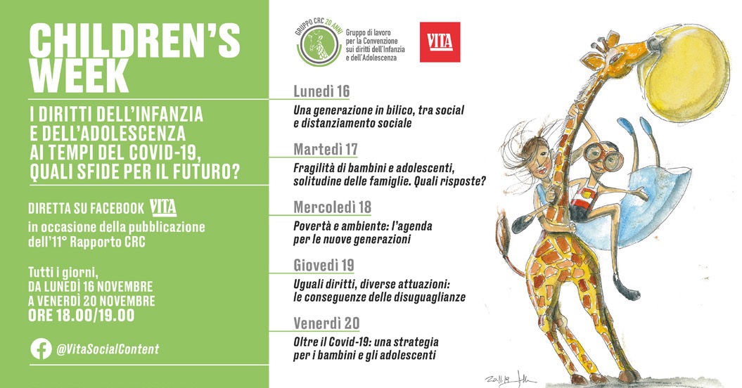 Quest’anno il lancio del Rapporto avviene online, in partnership con Vita, alla presenza di operatori, esperti e istituzioni. Cinque appuntamenti di riflessione che ci accompagneranno verso la Giornata Internazionale dei diritti dell’infanzia e dell’adolescenza del 20 novembre con una maggiore consapevolezza di quanto ancora oggi siano necessarie voci che dicono “prima i bambini e gli adolescenti”. Dal 16 al 20 novembre si terranno perciò una serie di incontri su queti temi, dalle ore 18 alle ore 19.