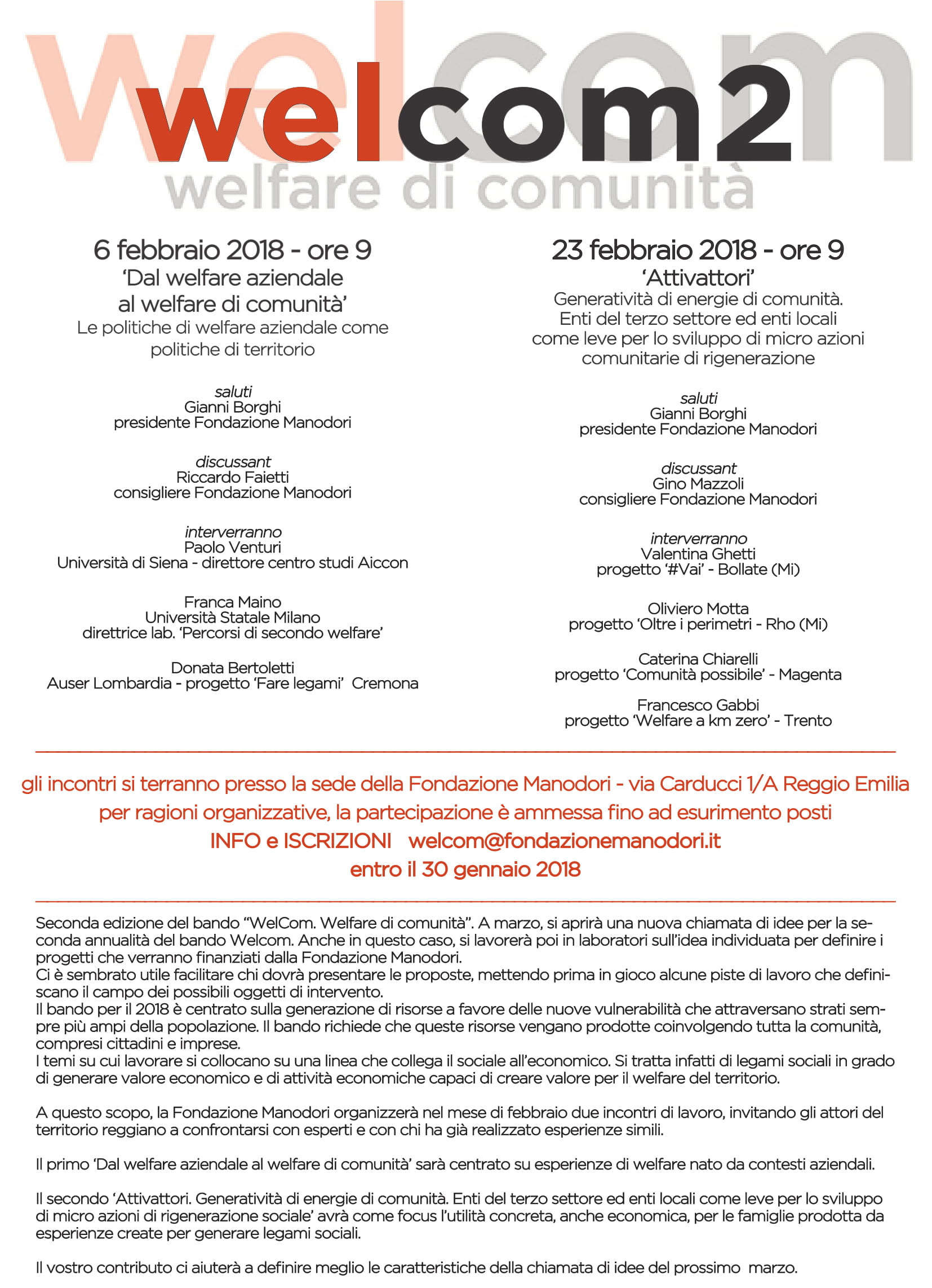 In occasione della seconda edizione del bando "WelCom. Welfare di comunità", progetto finanziato dalla Fondazione Manodori, saranno realizzati due incontri nel corso del mese di febbraio.