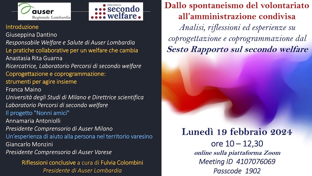 Auser Lombardia e Percorsi di secondo welfare organizzano l’evento “Dallo spontaneismo del volontariato all’amministrazione condivisa” durante il quale saranno presentate analisi, riflessioni ed esperienze su coprogettazione e coprogrammazione a partire dal Sesto Rapporto sul secondo welfare.
