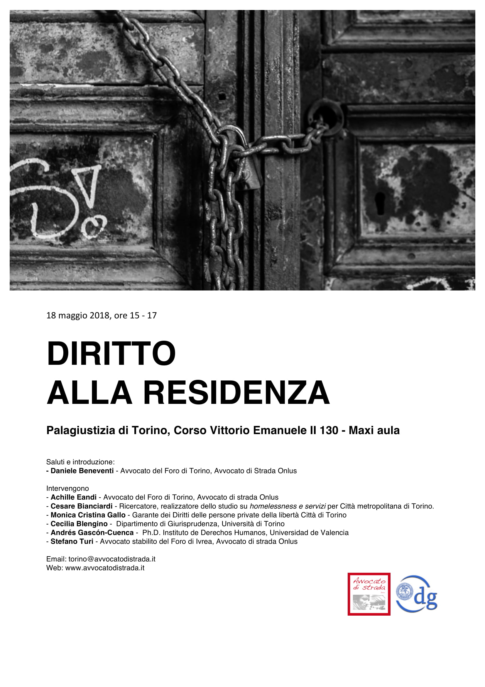 La sezione di Torino di Avvocato di Strada Onlus organizza la tavola rotonda “Diritto alla residenza” per riflettere ed approfondire questo tema. L’evento avrà luogo venerdì 18 maggio, dalle 15 alle 17, presso la Maxi Aula del Palazzo di Giustizia di Torino (corso Vittorio Emanuele II 130).