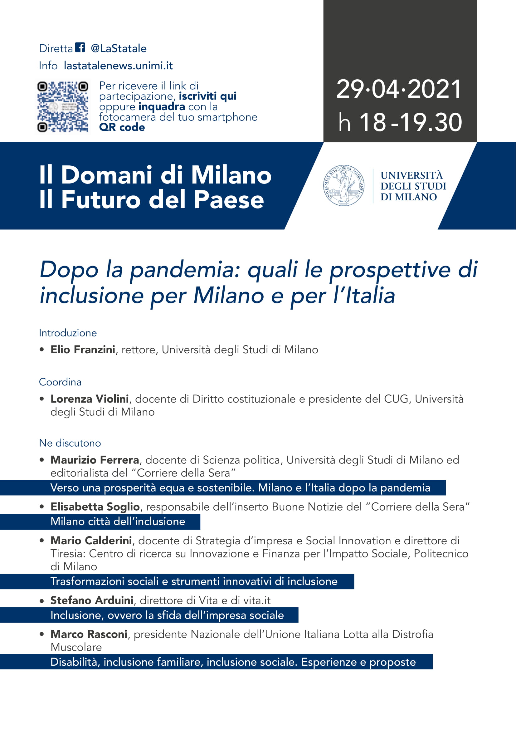 Giovedì 29 aprile si terrà il webinar “Dopo la pandemia: quali le prospettive di inclusione per Milano e per l’Italia“. All’incontro, promosso dall’Università degli Studi di Milano, parteciperà anche Maurizio Ferrera, supervisore scientifico di Percorsi di secondo welfare.