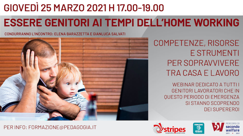 Ma cosa significa davvero essere un genitore in home working ai tempi della pandemia? Quali sono i vincoli e quali sono le opportunità per i genitori lavoratori? Se ne parlerà nel corso del webinar “Essere genitori ai tempi dell’home working” organizzato dalla Cooperativa Sociale Stripes, che si svolgerà il prossimo 25 marzo alle 17.00.