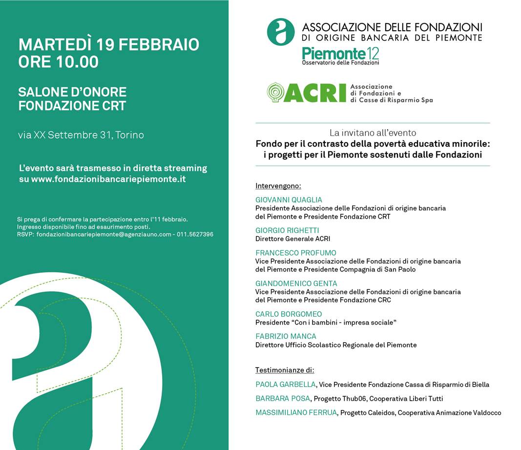 Il prossimo 19 febbraio a Torino, dalle ore 10 presso il Salone d’onore di Fondazione CRT, si svolgerà l’evento “Fondo per il contrasto della povertà educativa minorile: i progetti per il Piemonte sostenuti dalle Fondazioni”. L’evento è organizzato dall’Associazione delle Fondazioni di origine bancaria del Piemonte, dall’Acri e dall’Osservatorio Piemonte 12.