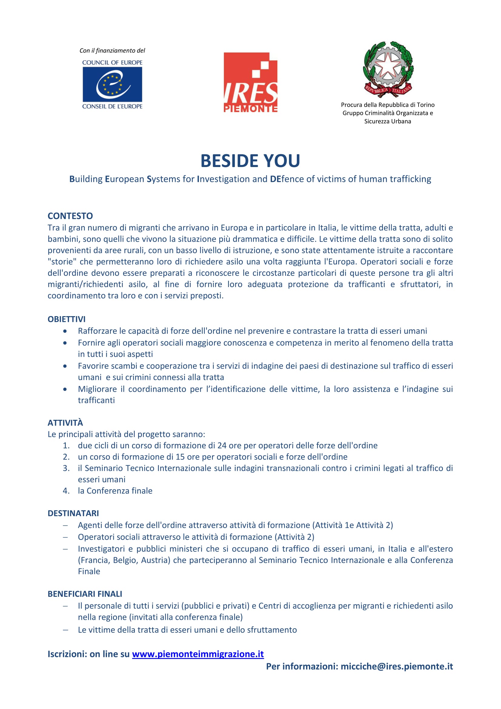 L’IRES Piemonte realizza, in collaborazione con la Procura della Repubblica presso il Tribunale di Torino, il progetto “Beside You – Building European Systems for Investigations and Defence of Victims of Human Trafficking”. Il progetto è finanziato dal Consiglio d’Europa.