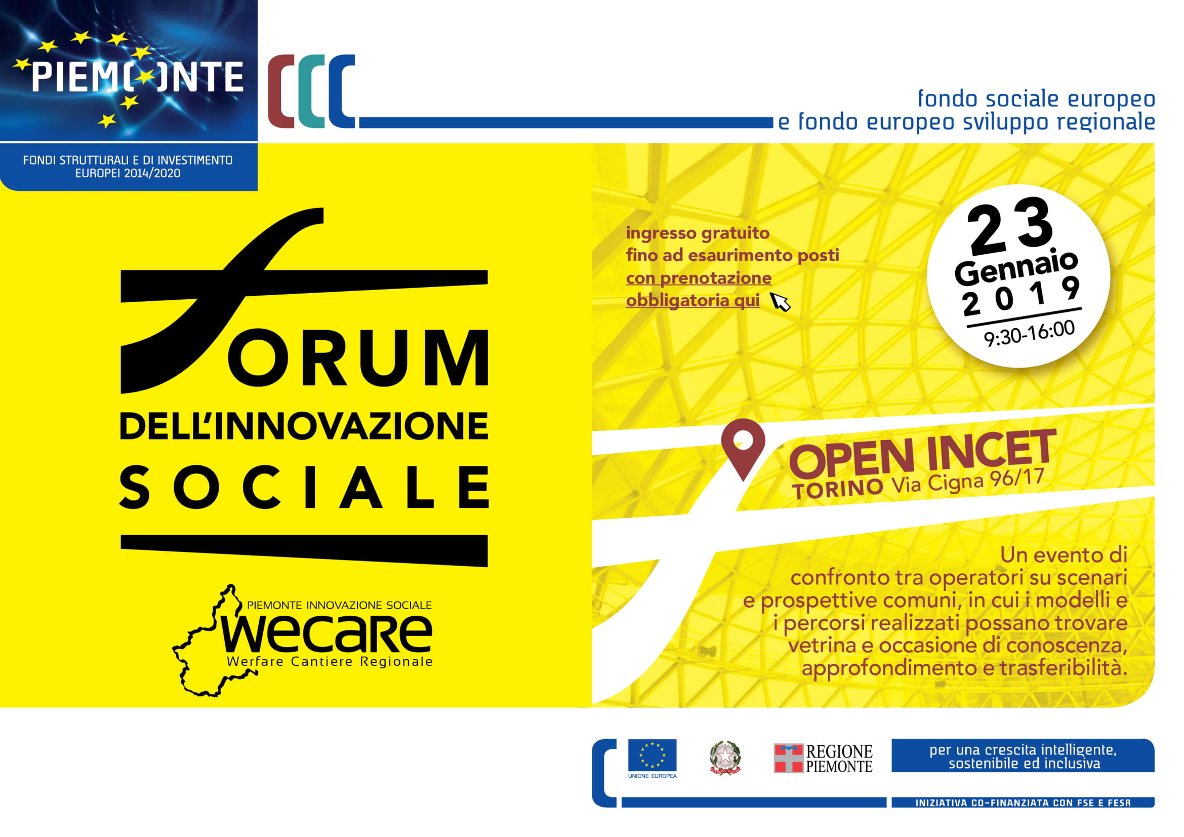 Mercoledì 23 gennaio 2019, a Torino, si terrà il "Forum sull’innovazione sociale in Piemonte", promosso da Open Incet. L’incontro, realizzato nell’ambito del piano WeCaRe – Welfare Cantiere Regionale, vuole essere un’occasione di confronto tra la Commissione Europea, le Regioni e gli operatori, su scenari e prospettive comuni, in cui i modelli e i percorsi realizzati in Piemonte possano trovare vetrina e occasione di conoscenza, approfondimento e trasferibilità.