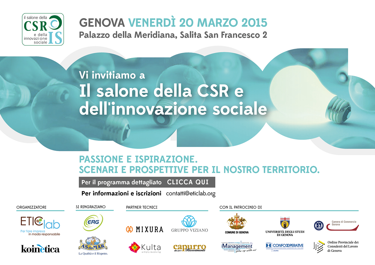 Venerdì 20 marzo dalle 10.00 alle 18.00, presso il Palazzo della Meridiana di Genova, si terrà la prima edizione della tappa genovese del Salone della CSR e dell’Innovazione Sociale sul tema “Scenari e prospettive per il nostro territorio”.