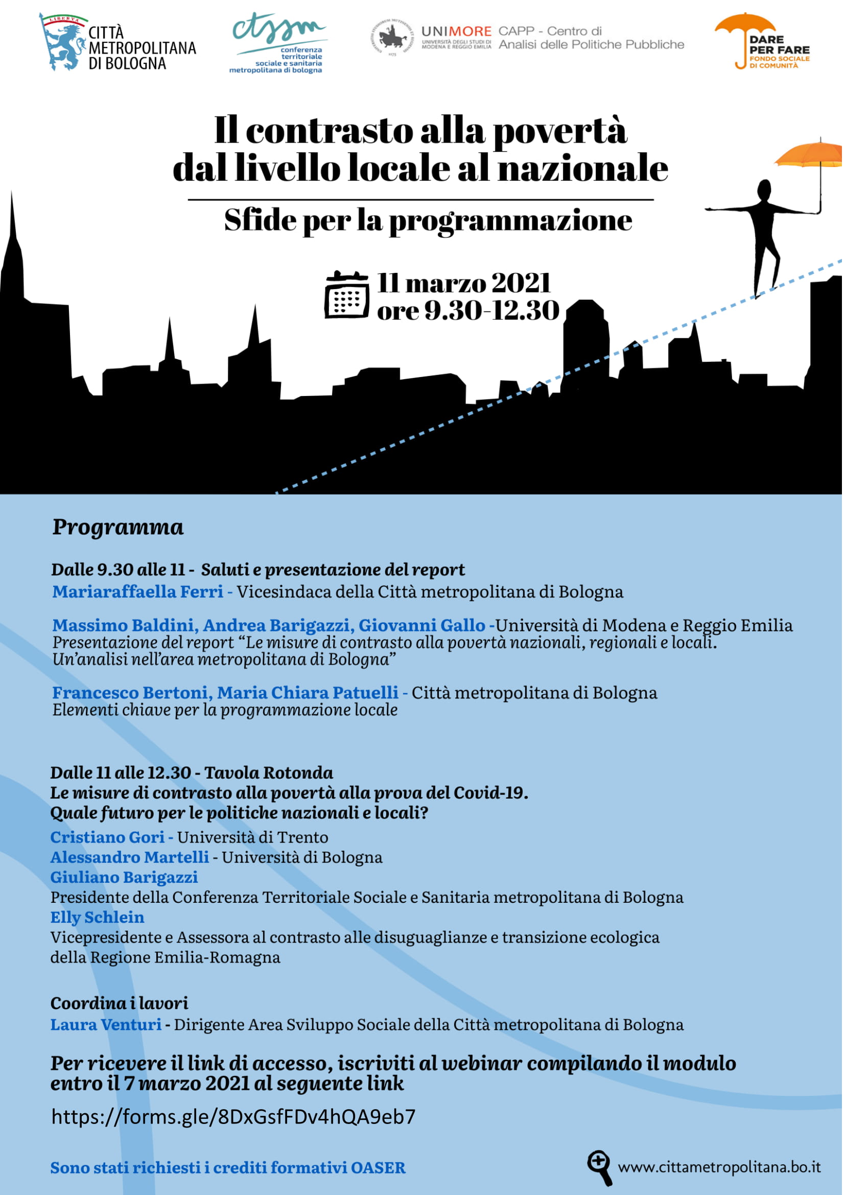 La Città Metropolitana di Bologna promuove per giovedì 11 marzo il webinar “Il contrasto alla povertà dal livello locale al nazionale: sfide per la programmazione“, che si terrà dalle ore 9.30 alle ore 12.30.