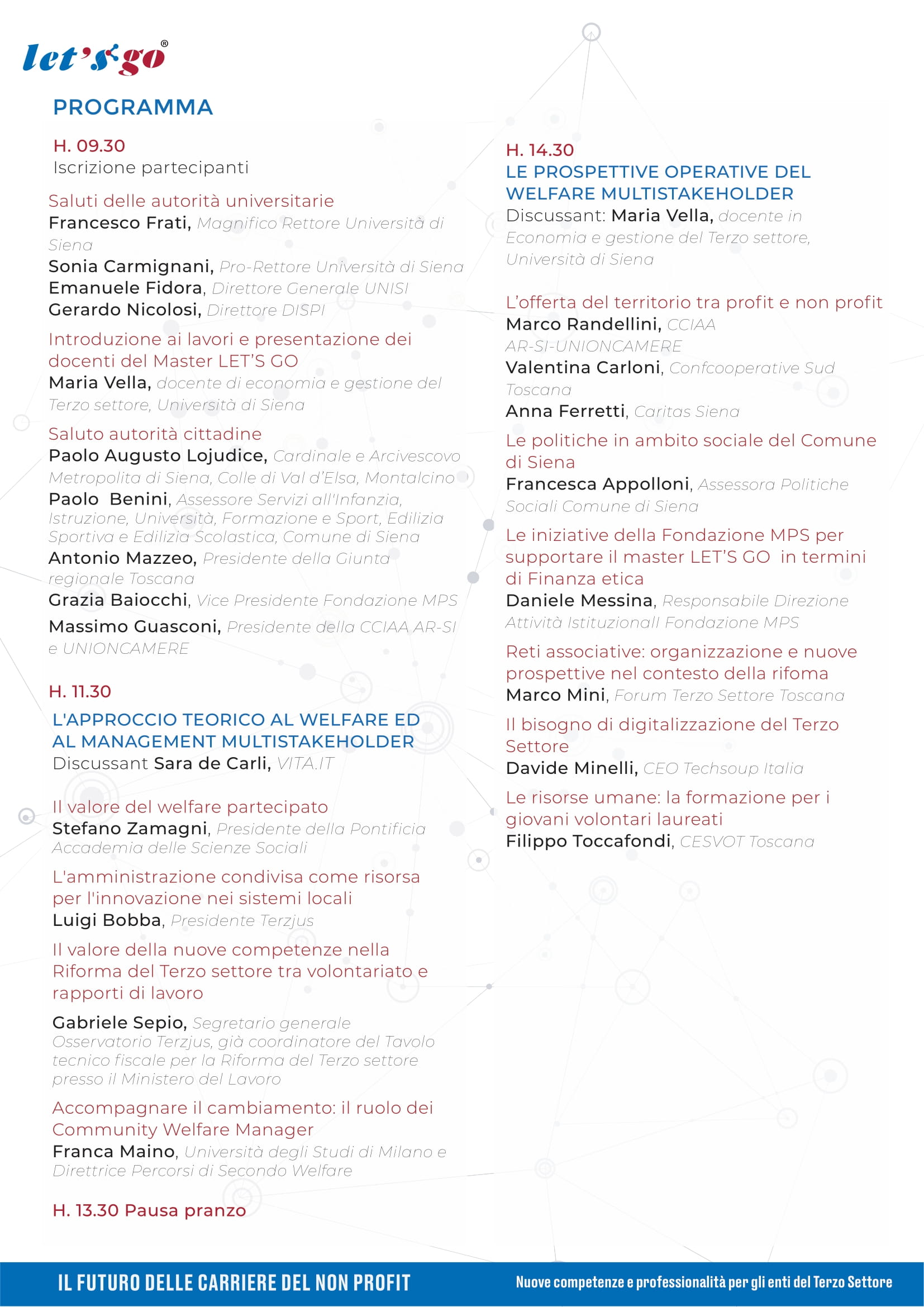 L’evento sarà un’occasione per approfondire il ruolo delle politiche di co-programmazione e di co-progettazione previste dalla Riforma del Terzo Settore nel mercato pubblico, privato e sociale. Sarà inoltre presentato il Master Let’s Go dell’Università di Siena, dedicato proprio allo sviluppo delle competenze necessarie per operare nel non profit.