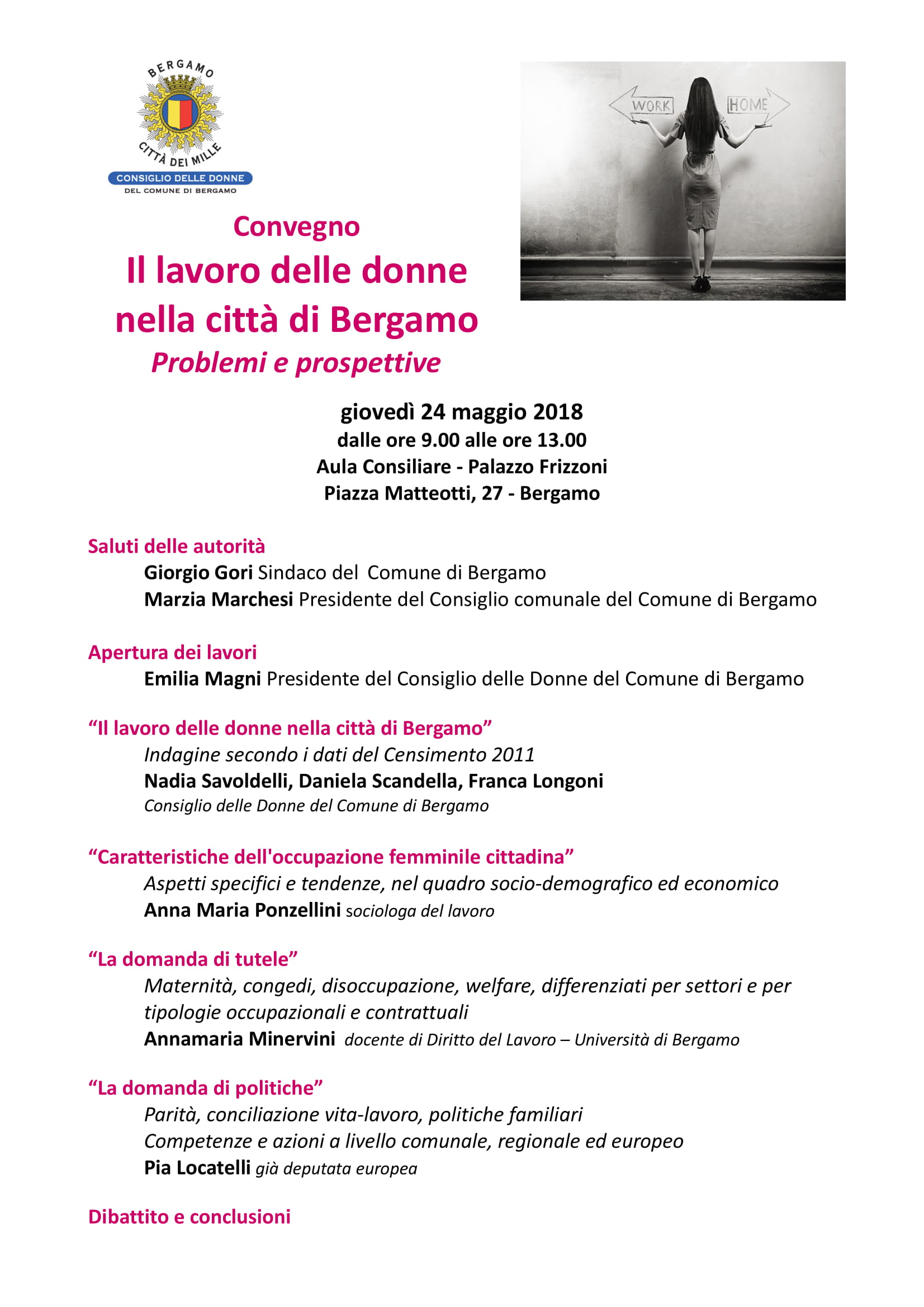 Giovedì 24 maggio 2018 – dalle ore 9.00 alle ore 13.00 – a Bergamo, si terrà l’evento "Il lavoro delle donne nella città di Bergamo: problemi e prospettive". Il luogo dell’incontro sarà l’Aula Consiliare – Palazzo Frizzoni (Piazza Matteotti, 27).