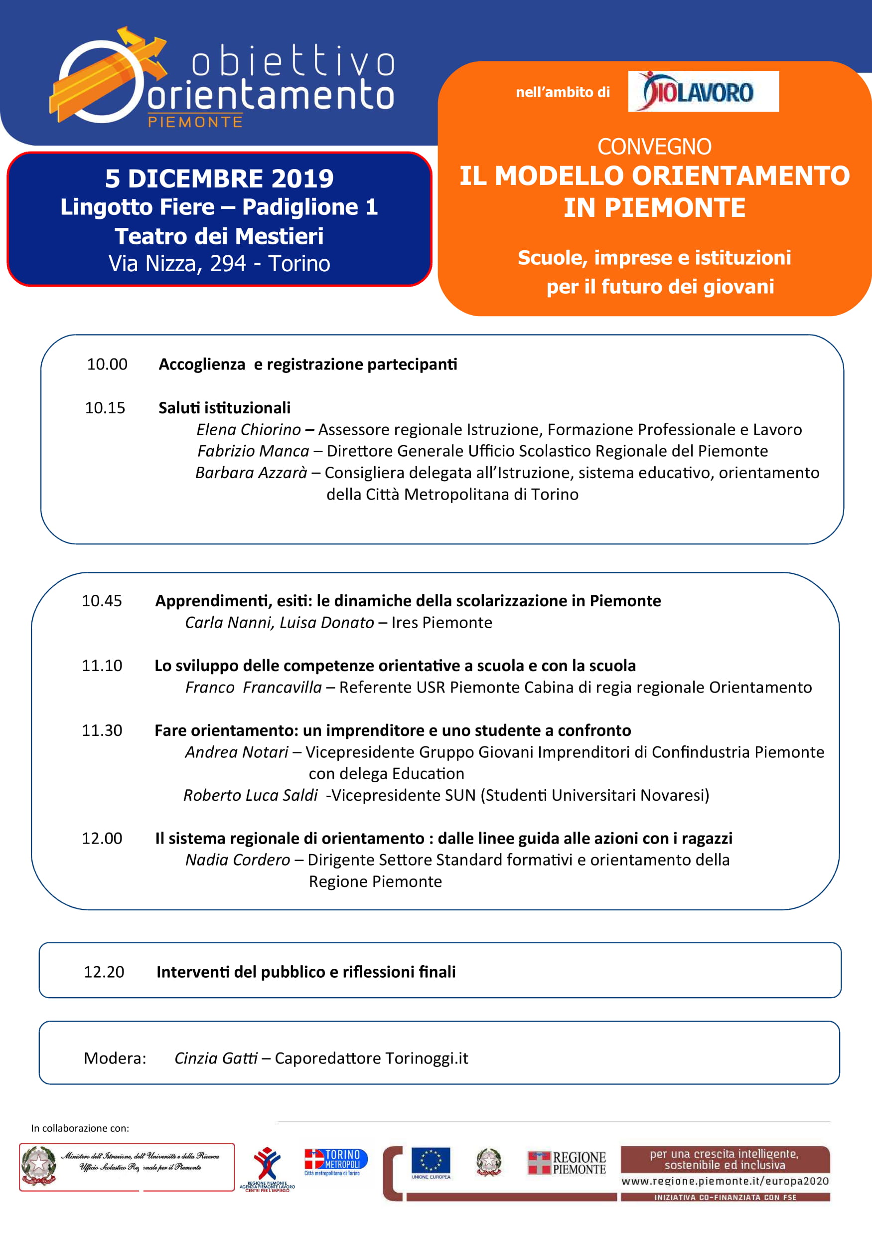 La Regione Piemonte organizza il convegno "Il modello orientamento in Piemonte. Scuole, imprese e istituzioni per il futuro dei giovani", che si svolgerà nell’ambito della manifestazione "Io Lavoro – World Skills" il prossimo 5 dicembre dalle ore 10.00 a Torino. L’evento si terrà presso Lingotto Fiere, Padiglione 1, Teatro dei Mestieri.