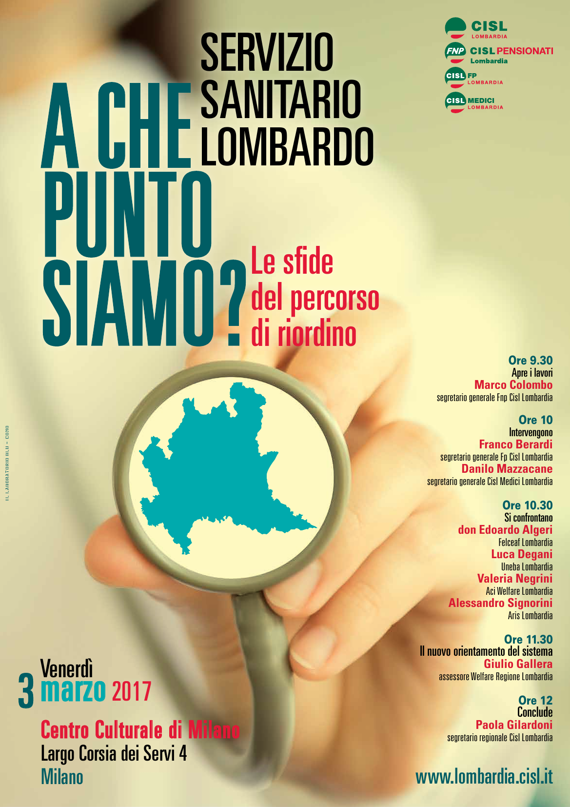 Cisl Lombardia – insieme a FNP, FP e Cisl medici – stanno organizzando per il giorno venerdì 3 marzo 2017 l’evento "Il sistema sanitario lombardo: le sfide del percorso di riordino", che avrà come tema principale il percorso di rinnovamento del Sistema Sanitario della Regione Lombardia, avviatosi con l’approvazione della Legge Regionale n. 23 del 11 agosto 2015. L’incontro si terrà dalle ore 9.00 alle ore 14.00, presso il Centro Culturale di Milano in via Largo Corsia dei Servi 4.