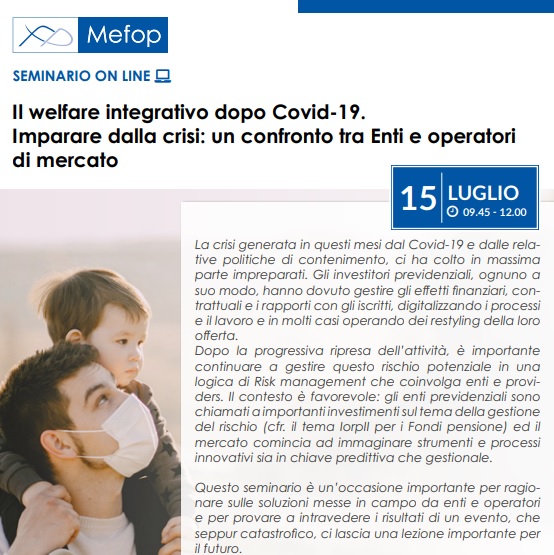 Proprio per approfondire questo tema, per la mattina del prossimo 15 luglio Mefop promuove il webinar "Il welfare integrativo dopo Covid-19. Imparare dalla crisi: un confronto tra Enti e operatori di mercato" come occasione per ragionare sulle soluzioni messe in campo da enti e operatori e per provare a intravedere i risultati di un evento, che seppur catastrofico, ci lascia una lezione importante per il futuro.