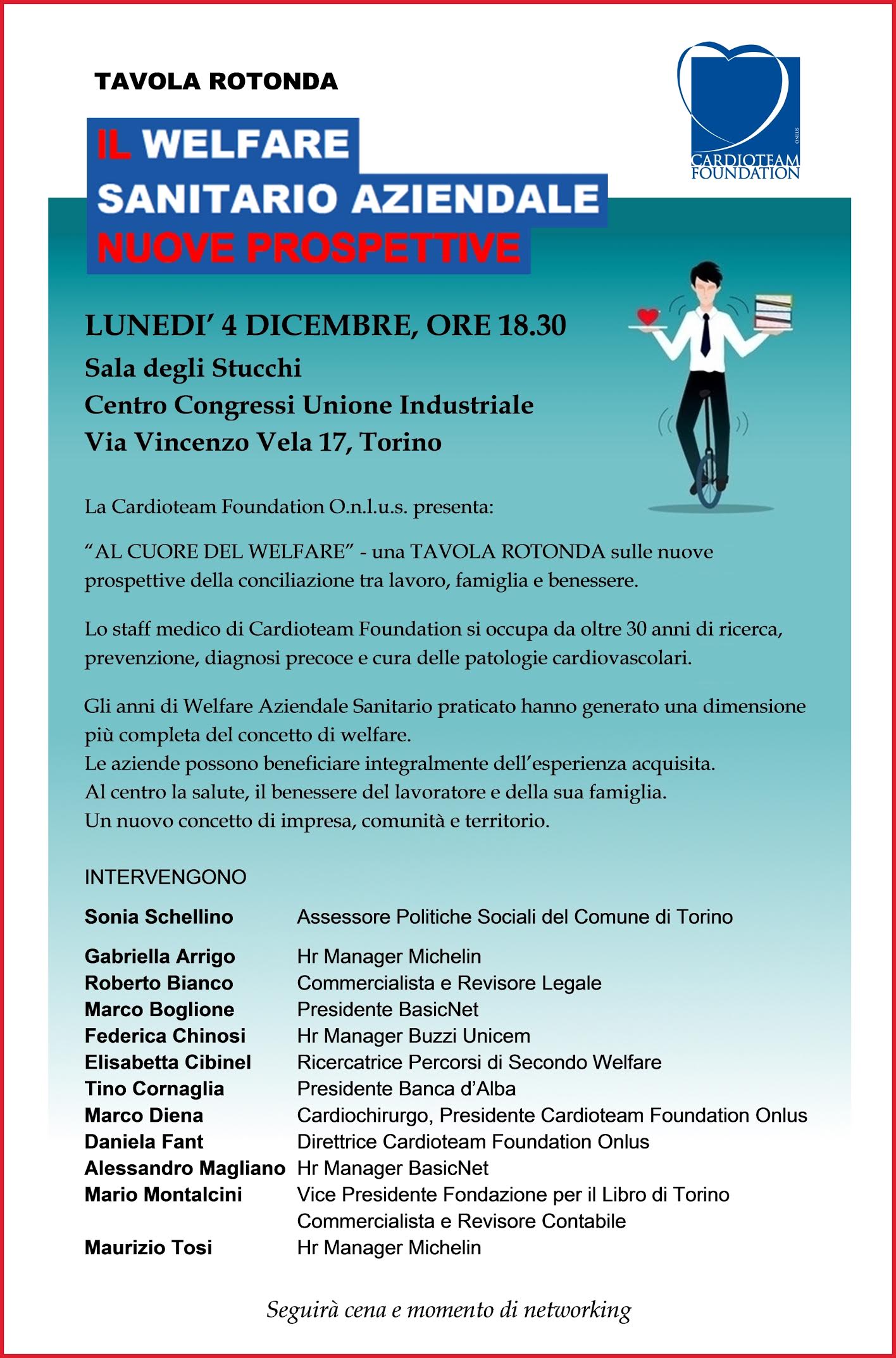 Cardioteam Foundation (realtà di cui ci siamo occupati in un precedente articolo) organizza per lunedì 4 dicembre (dalle ore 18.30) il convegno "Il welfare sanitario aziendale". L’incontro si terrà a Torino, presso il Centro Congressi Unione Industriale, via Vincenzo Vela 17.