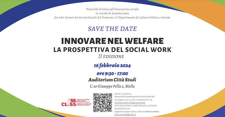 I corsi di laurea in Servizio sociale e in Politiche e servizi sociali dell’Università degli Studi di Torino presentano la seconda edizione di “Innovare nel welfare. La prospettiva del social work”, un evento che avrà luogo a Biella il 16 febbraio dalle 9.30 alle 17.00.