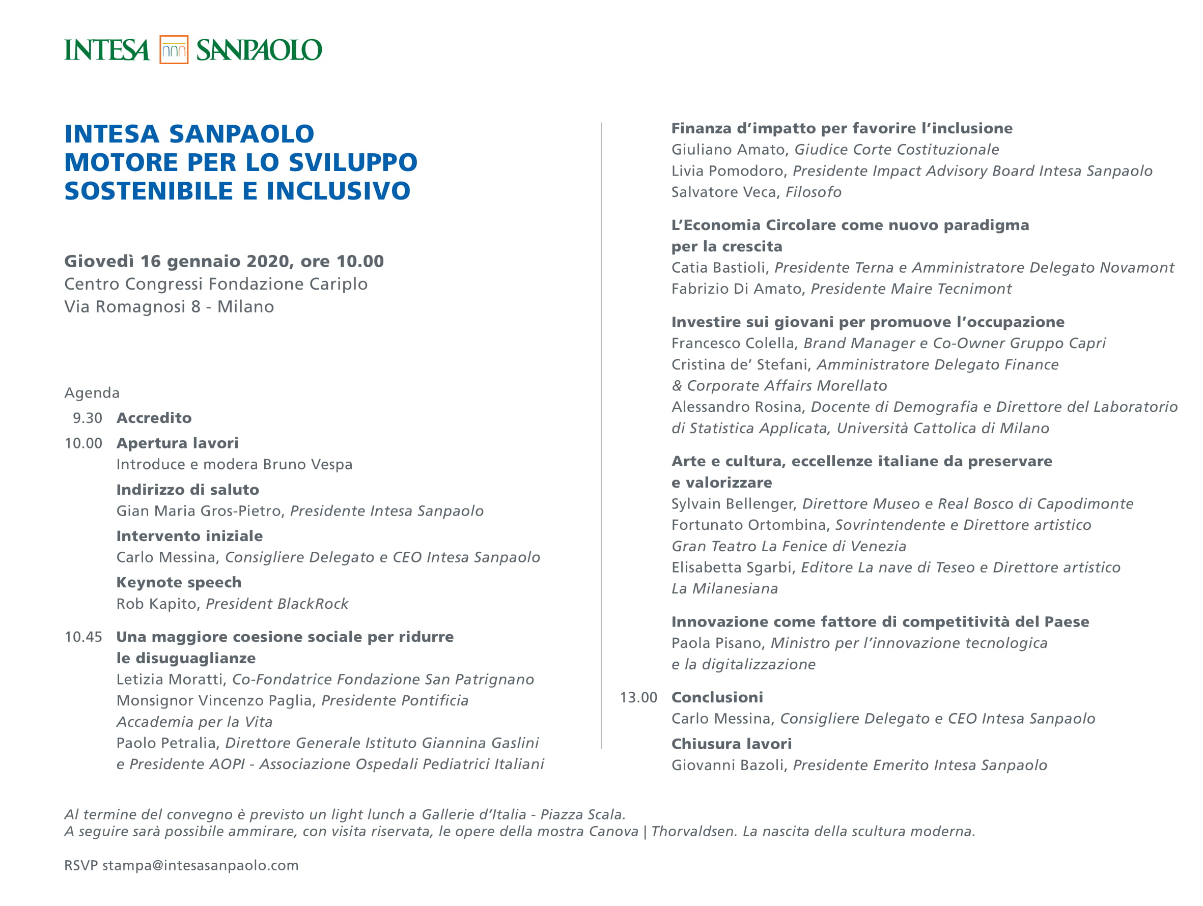 Il prossimo 16 gennaio 2020, a Milano, presso il Centro Congressi Fondazione Cariplo in Via Romagnosi 8, si terrà l’evento "Intesa Sanpaolo: motore per lo sviluppo sostenibile e inclusivo". Nel corso dell’incontro saranno presentati i risultati e gli obiettivi dell’impegno di Intesa Sanpaolo per il sociale, i giovani, l’ambiente, la cultura e l’innovazione.
