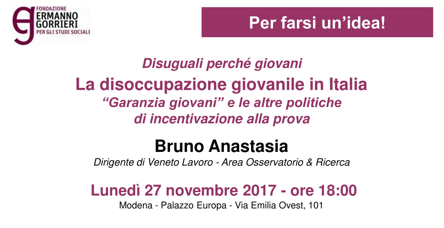 L’incontro fa parte di un ciclo dal titolo "Disuguali perché giovani". All’evento del 27 novembre ci sarà Bruno Anastasia, Dirigente di Veneto Lavoro – Area Osservatorio e Ricerca.