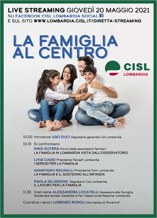Giovedì 20 maggio alle 10.00 Cisl Lombardia organizza il webinar “La famiglia al centro” per promuovere il confronto tra diverse esperienze, istituzioni e organizzazioni su questi temi, e favorire in questo modo la costruzione di un sistema regionale integrato a sostegno della famiglia.