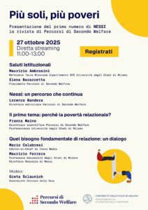 Il 27 ottobre dalle 11.00 si svolgerà l’evento online “Più soli, più poveri”, in cui presenteremo ufficialmente Nessi, la nostra nuova rivista. Racconteremo da dove nasce, come sarà composta e quali obiettivi si propone, ma soprattutto approfondiremo il tema del suo primo numero: la povertà relazionale.