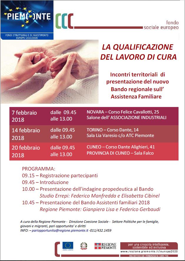 Mercoledì 7 febbraio dalle 9.45 alle 13 si terrà a Novara, presso il salone dell’Associazione Industriali (corso Felice Cavallotti, 25), un incontro organizzato dalla Regione Piemonte per presentare il nuovo Bando regionale che intende promuovere la creazione di un sistema integrato nell’ambito dell’assistenza familiare.