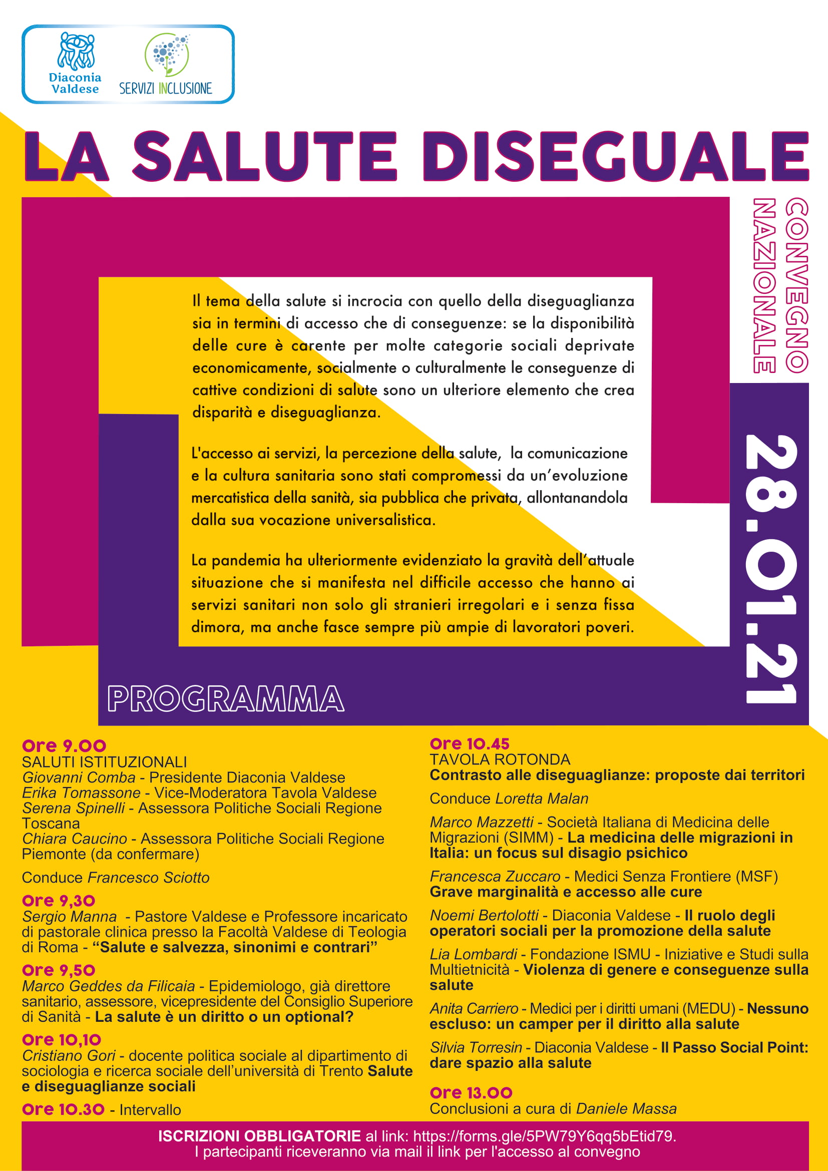 Giovedì 28 gennaio, dalle ore 9 alle ore 13, si terrà online la nuova edizione del Convegno Nazionale di Servizi Inclusione, dal titolo “La salute diseguale“.