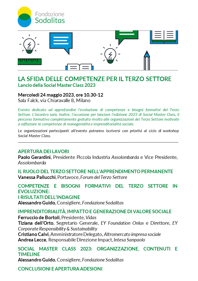 Sarà l’occasione anche per lanciare l’edizione 2023 di Social Master Class, percorso formativo completamente gratuito rivolto alle organizzazioni del Terzo Settore motivate a rafforzare le competenze di managerialità e imprenditorialità sociale delle proprie persone. L’iniziativa innoverà l’offerta formativa, includerà nuovi temi, privilegerà i casi concreti e le esperienze di successo.