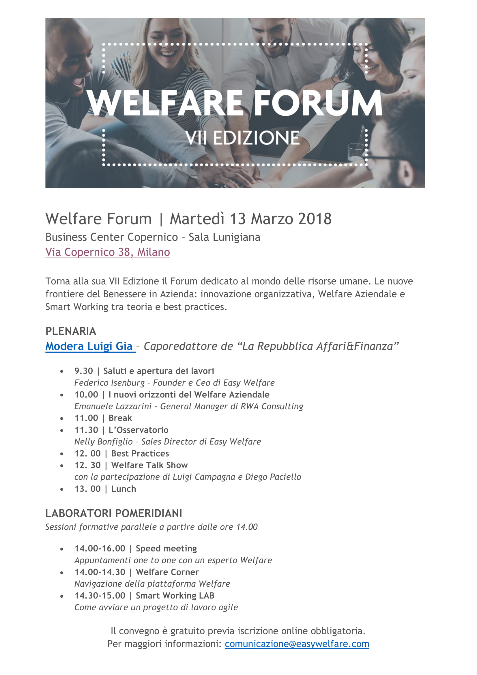 Martedì 13 marzo, il provider di welfare aziendale Easy Welfare terrà l’evento dal titolo "Le nuove frontiere del Welfare Aziendale analizzate tra teorie e Best Practices". L’incontro si terrà a Milano, presso il Business Center Copernico – Sala Lunigiana (Via Copernico 38).