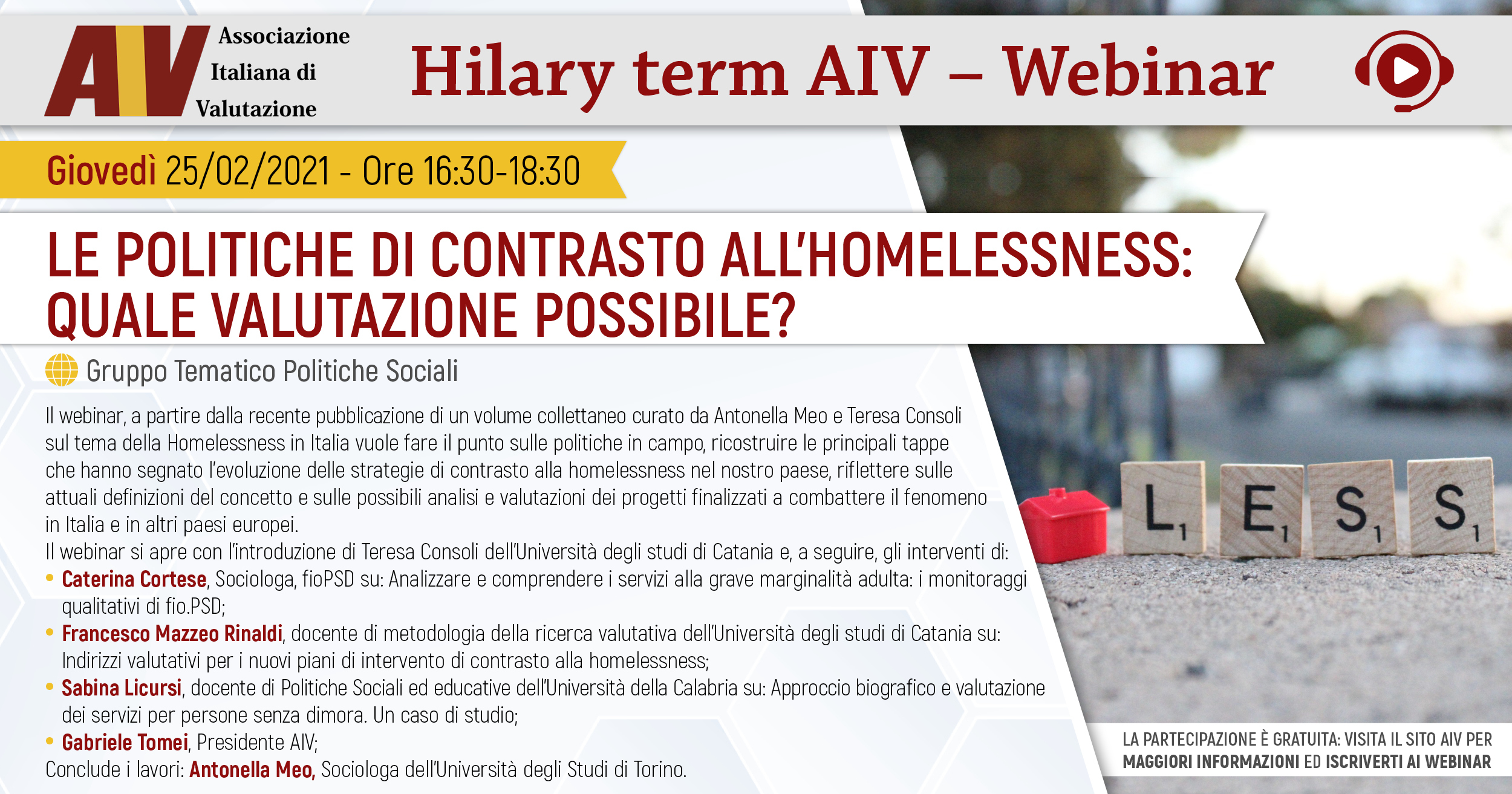 Vi segnaliamo il webinar “Le politiche di contrasto all’Homelessness: quale valutazione possibile?” in programma per giovedì 25 febbraio dalle ore 16:30 alle ore 18:30. L’evento online è promosso dall’Associazione Italiana di Valutazione, AIV.