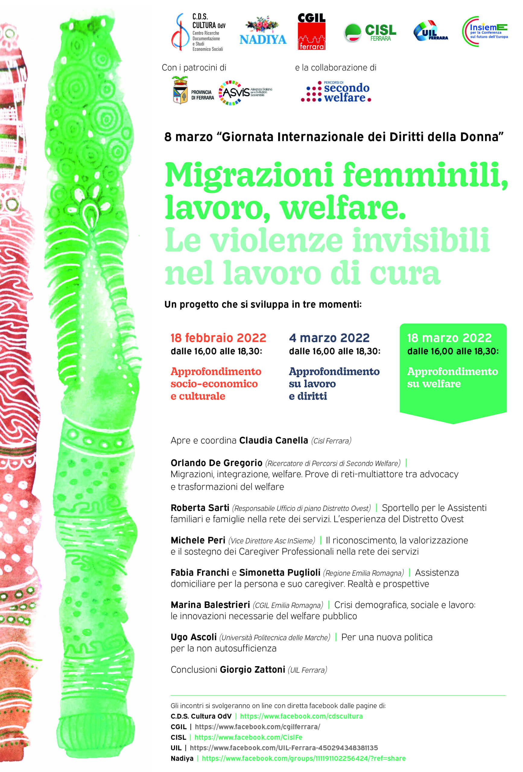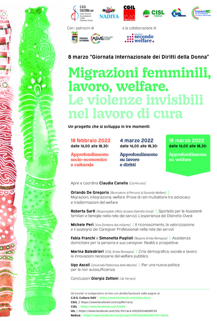 Prosegue il ciclo di iniziative “Migrazioni femminili, lavoro, welfare. Le violenze invisibili nel lavoro di cura” promosso da C.D.S. Cultura OdV,CGIL, CISL, UIL, l’Associazione NADIYA e il Movimento Federalista Europeo in occasione della Giornata Internazionale per i diritti della donna. Il progetto rientra nell’ambito della Conferenza sul Futuro dell’Europa e si avvale della collaborazione di Percorsi di secondo welfare e del patrocinio della Provincia di Ferrara e di ASviS.