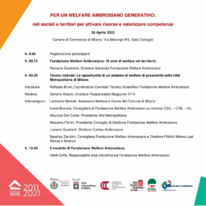 Il prossimo 28 aprile si terrà l’incontro “Per un welfare ambrosiano generativo. Reti sociali e territori per attivare risorse e valorizzare competenze“. L’evento si terrà a Milano, presso la la Sala Consiglio della Camera di Commercio di Milano, via Meravigli 9/B, dalle ore 9.