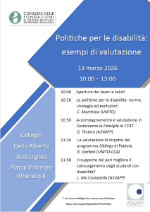 Nell’ambito del percorso di accompagnamento rivolto alla Consulta delle Fondazioni di origine bancaria del Piemonte e della Liguria, finalizzato a rafforzare le competenze in tema di valutazione delle politiche pubbliche, ASVAPP organizza il seminario tematico “Politiche per le disabilità: esempi di valutazione”.