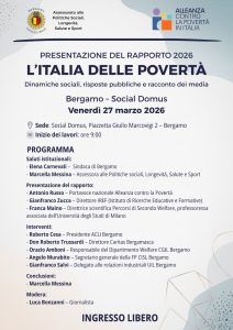 L’Alleanza Contro la Povertà in Italia presenta il rapporto 2026 “L’Italia delle povertà: dinamiche sociali, risposte pubbliche e racconto dei media” a Bergamo.