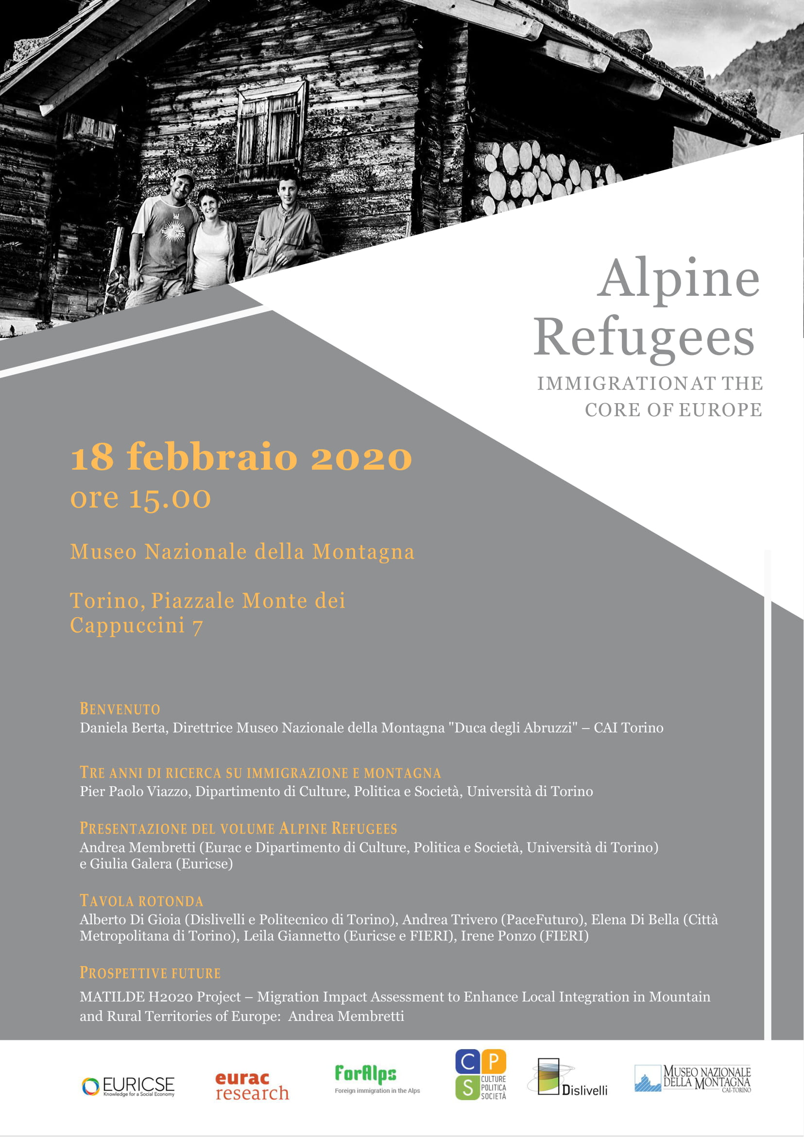 Vi segnaliamo la presentazione del volume "Alpine refugees. Immigration at the core of Europe", dedicato al tema delle migrazioni e dell’accoglienza. L’incontro si terrà a Torino , presso il Museo Nazionale della Montagna, il prossimo martedì 18 febbraio.