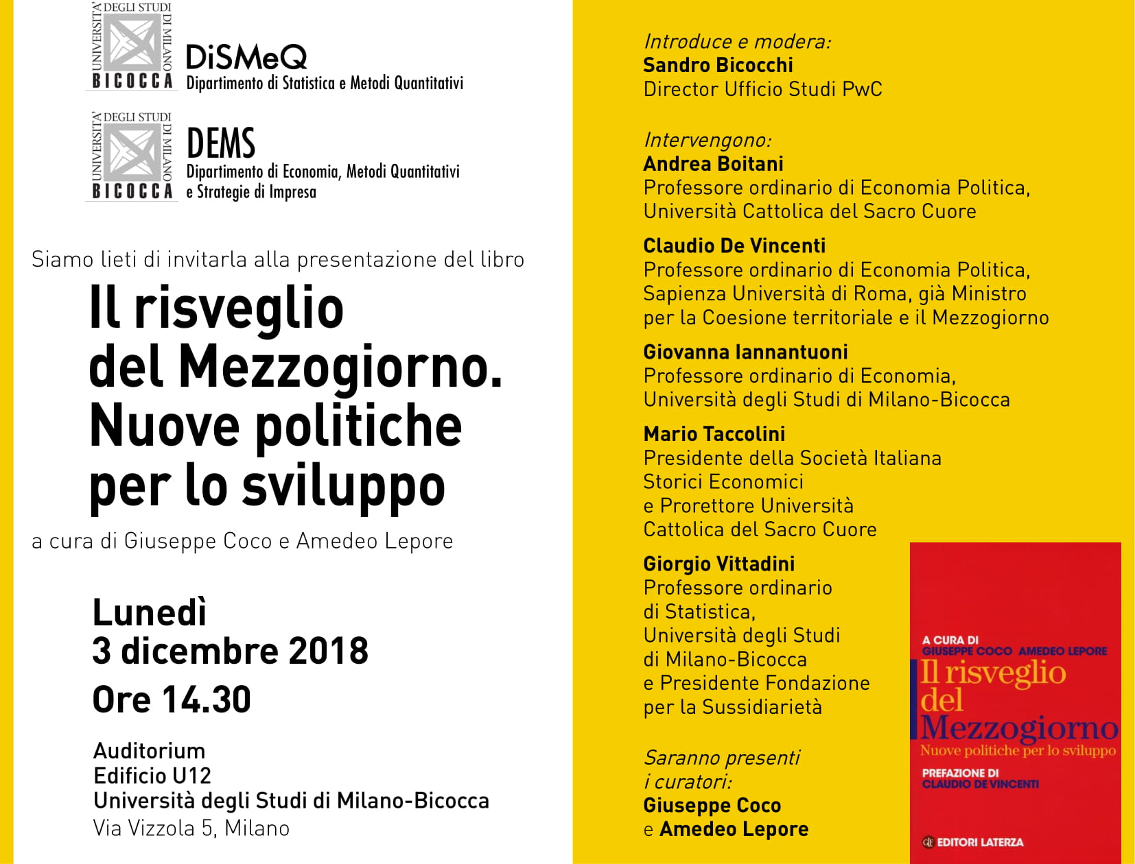 Lunedì 3 dicembre si terrà l’incontro di presentazione del libro "Il risveglio del Mezzogiorno. Nuove politiche per lo sviluppo", curato da Giuseppe Coco e Amedeo Lepore. L’evento avrà luogo a Milano, dalle ore 14.30, presso l’Auditorium dell’Università degli Studi di Milano-Bicocca (Edificio U12, via Vizzola, 5).