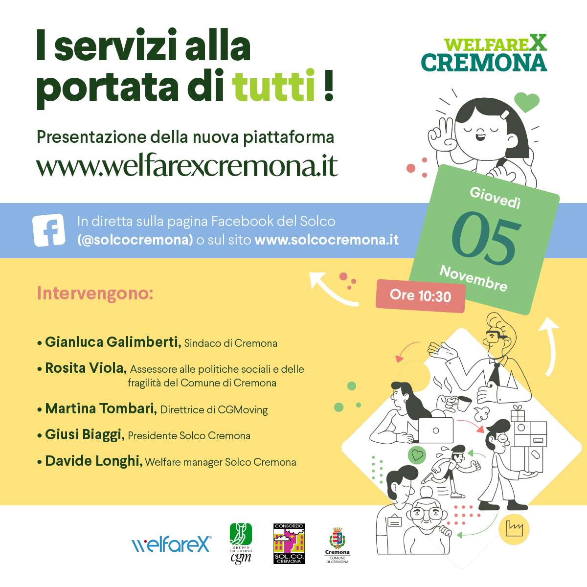 Vi segnaliamo la presentazione della nuova piattaforma WelfareXcremona – realizzata da CGMoving – che si terrà giovedì 5 novembre alle ore 10.30 in diretta sulla pagina Facebook del Consorzio Solco di Cremona e sul sito www.solcocremona.it.