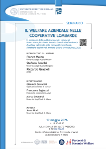 Il 19 maggio 2026 si terrà il seminario di presentazione del volume “Il welfare aziendale nelle cooperative lombarde. Dinamiche sociali e di mercato” di Franca Maino, Stefano Ronchi (Università degli Studi di Bergamo) e Riccardo Grazioli (MEIEC), che esplora il ruolo crescente del welfare aziendale nelle cooperative della Lombardia. Il volume analizza le opportunità e le criticità di questo modello, evidenziando come il contesto economico e sociale influisca sulla sua diffusione, soprattutto nei settori socio-educativi.