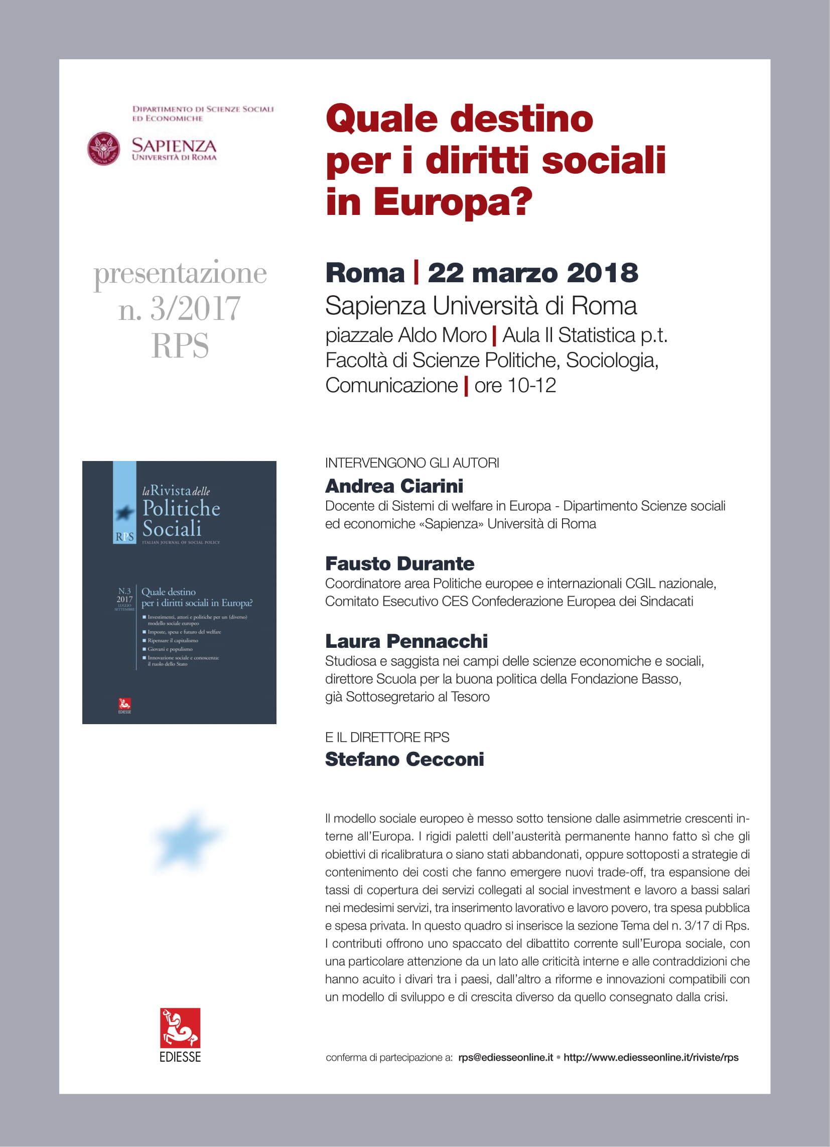 Vi segnaliamo la presentazione del volume n.3 2017 della Rivista delle Politiche Sociali, dal titolo "Quale destino per i diritti sociali in Europa?", che si terrà giovedì 22 marzo dalle ore 10 alle ore 12 presso la Facoltà di Scienze Politiche, Sociologia, Comunicazione, Aula II p.t di Statistica, Piazzale Aldo Moro 5, Università Sapienza di Roma.