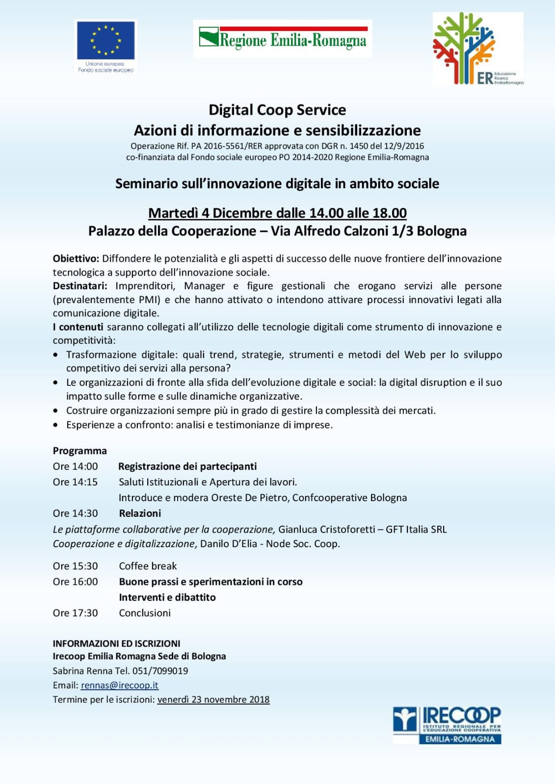 Per il prossimo martedì 4 dicembre, Irecoop Emilia Romagna organizza il "Seminario sull’innovazione digitale in ambito sociale". Il seminario si terrà a Bologna, presso il Palazzo della Cooperazione (Via Alfredo Calzoni 1/3), dalle ore 14.00 alle ore 18.00. L’obiettivo dell’incontro è quello di diffondere le potenzialità e gli aspetti di successo delle nuove frontiere dell’innovazione tecnologica a supporto dell’innovazione sociale.