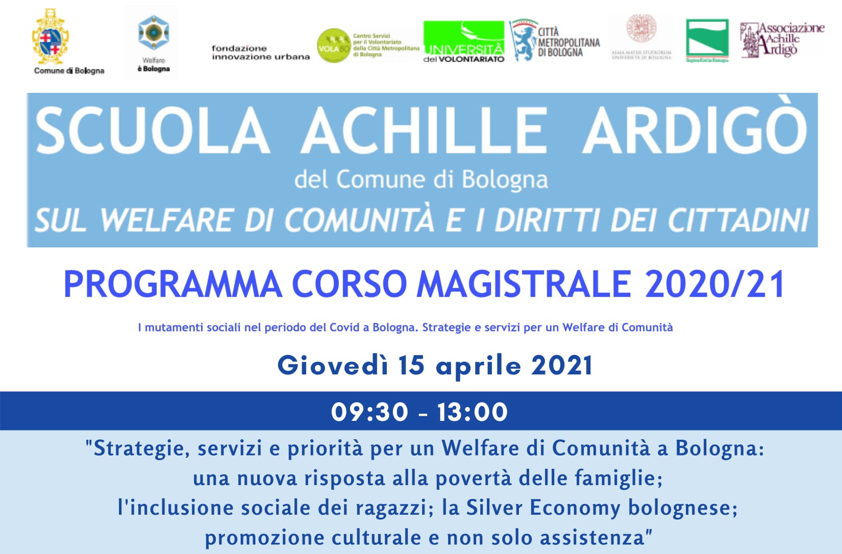 Vi segnaliamo il workshop, organizzato dalla Scuola Achille Ardigò del Comune di Bologna, che si terrà online giovedì 15 aprile 2021. Il tema dell’incontro sarà “Strategie, servizi e priorità per un welfare di comunità a Bologna: una nuova risposta alla povertà delle famiglie; l’inclusione sociale dei ragazzi; la Silver Economy bolognese; promozione culturale e non solo assistenza”.