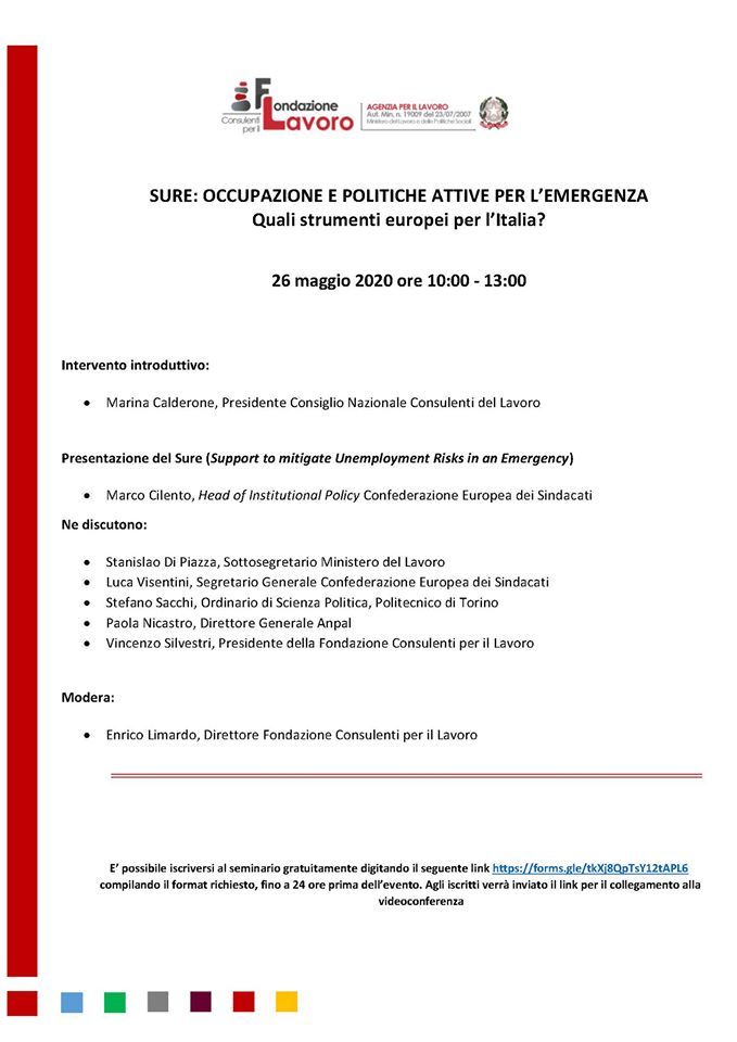 Si terrà il prossimo 26 maggio, dalle ore 10.00 alle ore 13.00, la videoconferenza “SURE: occupazione e politiche attive per l’emergenza. Quali strumenti europei per l’Italia?”, organizzata dalla Fondazione Consulenti per il Lavoro con l’obiettivo di presentare le opportunità messe a disposizione dall’Europa per supportare l’occupazione in questo momento di crisi.