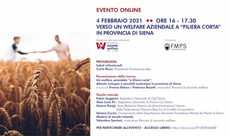 Il Rapporto “Un welfare aziendale ‘a filiera corta’. Attuale sviluppo e possibili evoluzioni in provincia di Siena”, esito delle ricerche condotte da Secondo Welfare, sarà presentato giovedì 4 febbraio alle ore 16.00, nel corso di un evento online. La ricerca sarà presentata da Franca Maino e Federico Razetti; seguirà poi una tavola rotonda, moderata da Valentino Santoni, a cui parteciperanno: Fabio Seggiani, Cgil Siena, Gian Luca Fe’, Femca Cisl Siena, Gianni Parigi, Federazione Toscana Banche di Credito Cooperativo, e Vareno Cucini, Fondazione Monte dei Paschi di Siena.