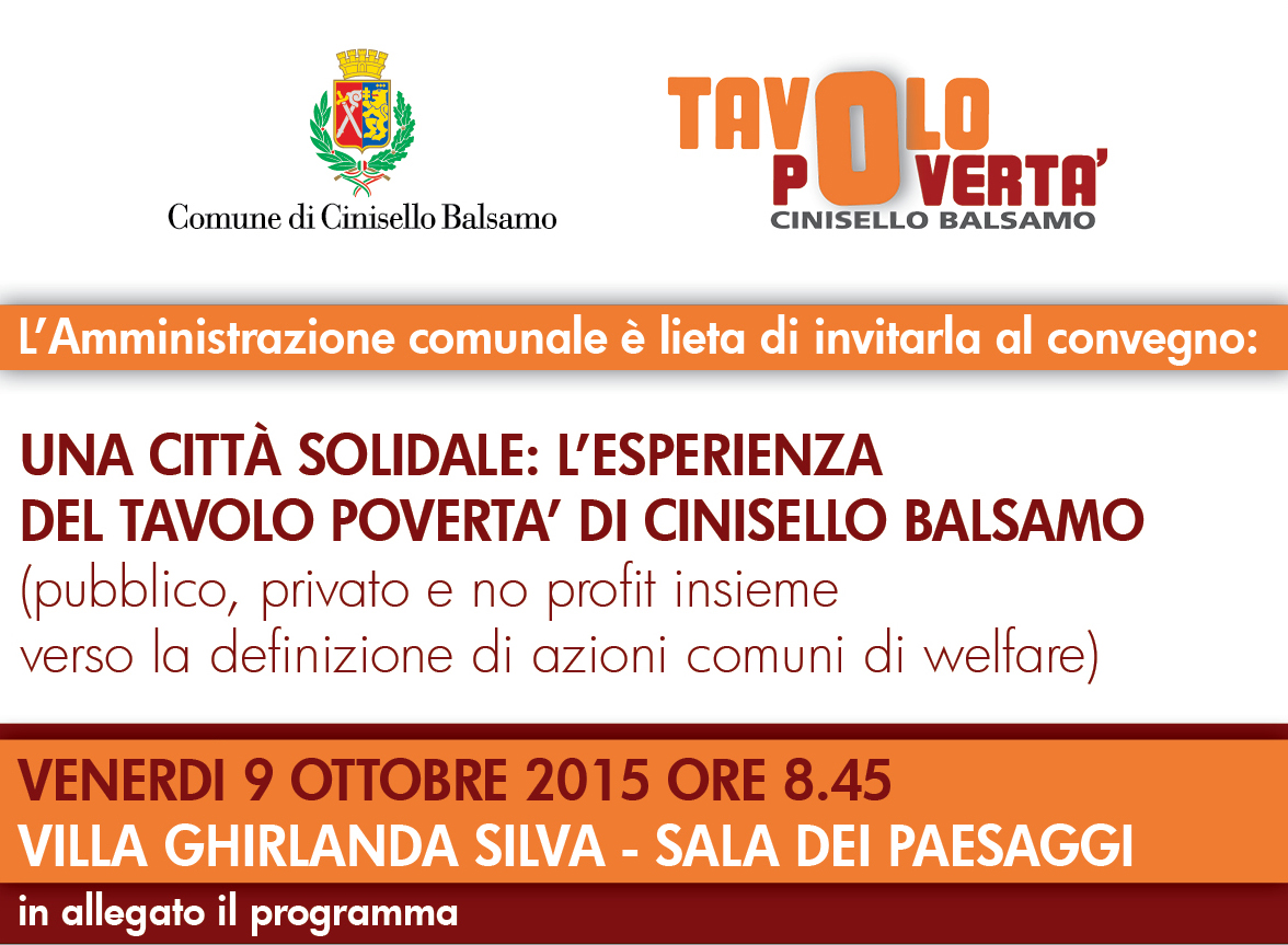 Venerdì 9 ottobre 2015, ore 8.45 – 13.30, si terrà il convegno “Una città solidale: l’esperienza del tavolo povertà di Cinisello Balsamo (pubblico, privato e no profit insieme verso la definizione di azioni comuni di welfare)”.