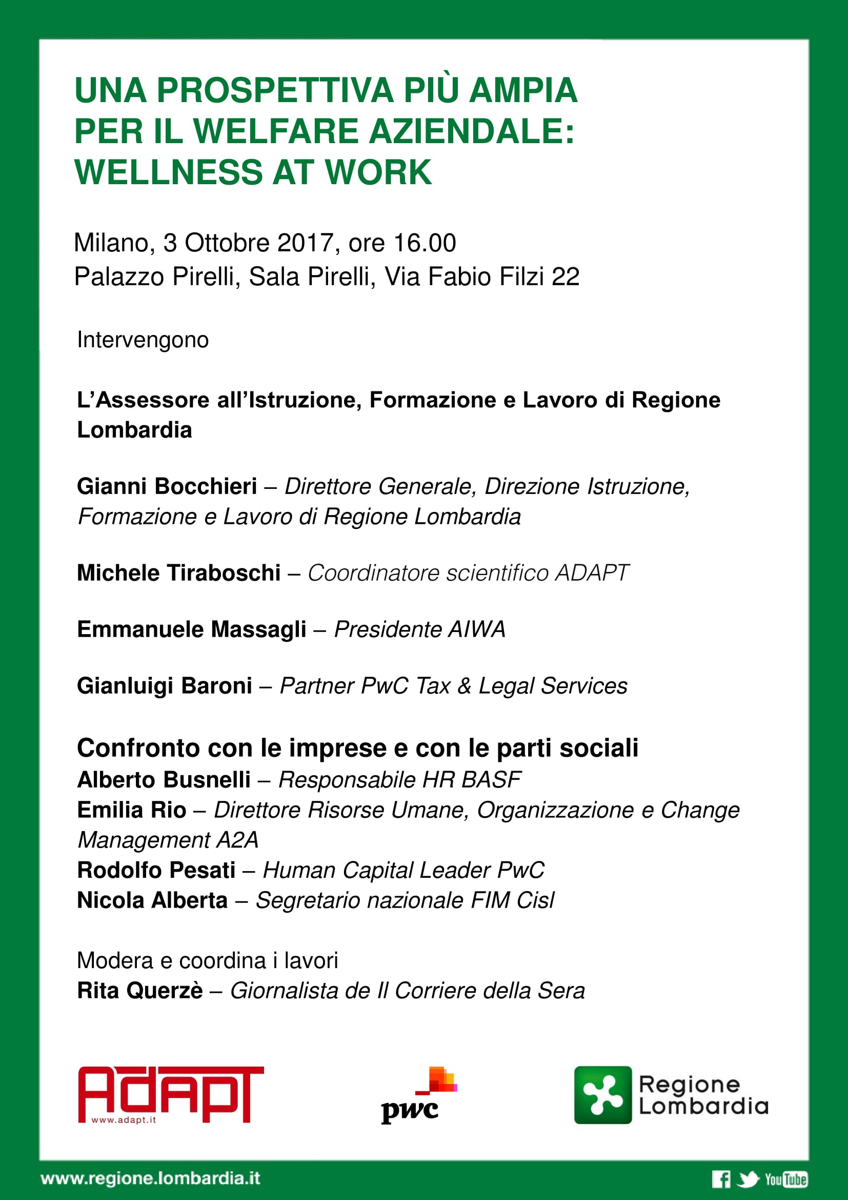 Il 3 ottobre 2017 si terrà a Milano un convegno dal titolo "Una prospettiva più ampia per il welfare aziendale: wellness at work". Il convegno è organizzato da Regione Lombardia in collaborazione con ADAPT e PwC. L’evento si terrà dalle 16.00 alle 19.00, presso il Palazzo Pirelli, Sala Pirelli, Regione Lombardia, Via Filzi n. 22 (Milano).