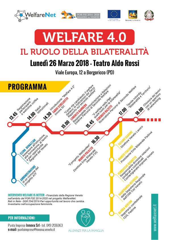 Lunedì 26 marzo a Borgoricco, in provincia di Padova, si svolgerà l’incontro "Welfare 4.0. Il ruolo della bilateralità". Durante l’evento Lorenzo Bandera e Federico Razetti presenteranno i contenuti del Terzo Rapporto sul secondo welfare, ed in particolare quanto emerso nel capitolo "Bilateralità, settori e territori. Diversi modelli di solidarietà a confronto".