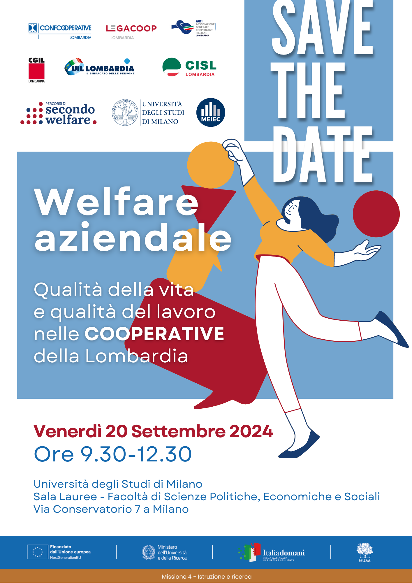 La ricerca sarà presentata nel corso dell’evento “Welfare aziendale. Qualità della vita e qualità del lavoro nelle cooperative della Lombardia“, che si terrà il 20 settembre alle 9.30 presso la Sala Lauree della Facoltà di Scienze Politiche, Economiche e Sociali dell’Università degli Studi di Milano, in via Conservatorio 7.