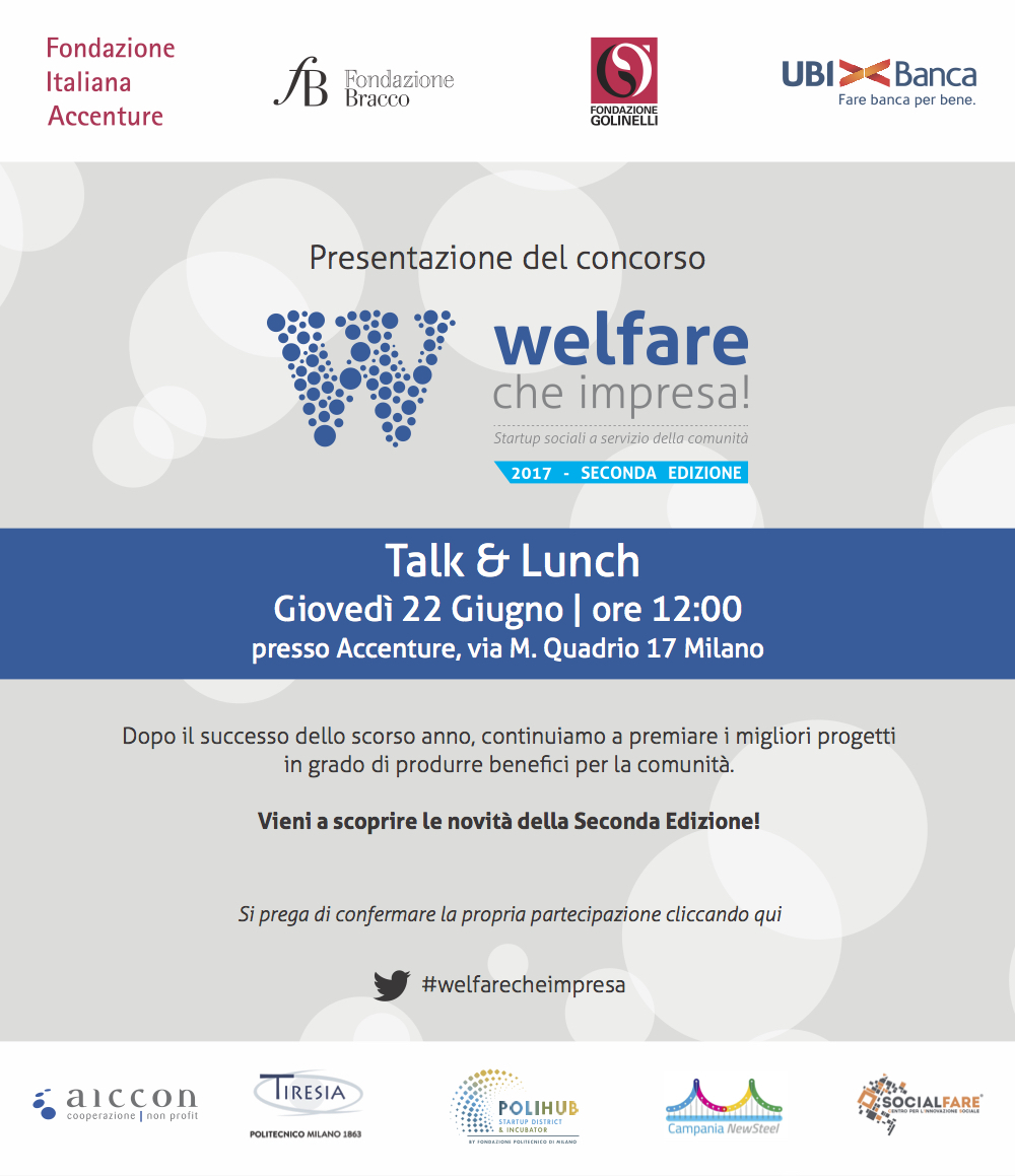 Dopo il successo dello scorso anno, "Welfare che impresa" – il concorso per idee progettuali promosso da Fondazione Italiana Accenture, UBI Banca, Fondazione Golinelli e Fondazione Bracco – parte per la seconda edizione. L’evento di presentazione si terrà il 22 giugno 2017 (dalle ore 12.00 alle ore 14.00), presso i locali della Fondazione Italiana Accenture, via Maurizio Quadrio 17, Milano.