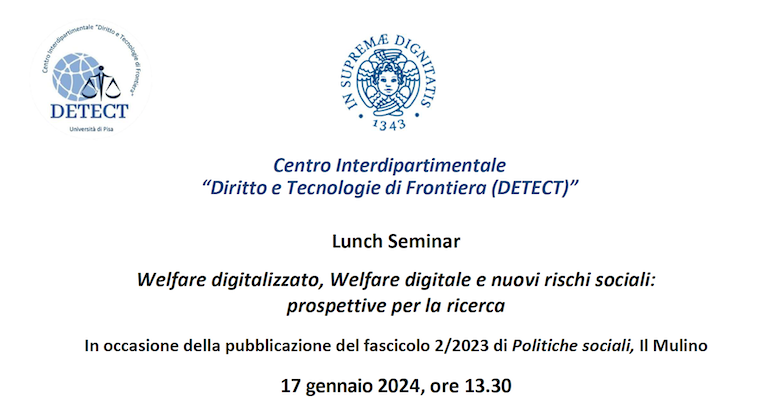 Il Centro Interdipartimentale "Diritto e Tecnologie di Frontiera" (DETECT) dell'Università di Pisa organizza un lunch seminar dal titolo "Welfare digitalizzato, Welfare digitale e nuovi rischi sociali: prospettive per la ricerca".