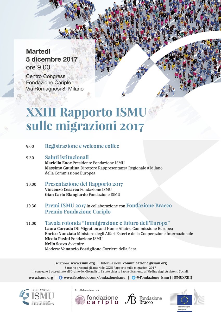 Martedì 5 dicembre 2017, a Milano, presso il Centro Congressi Cariplo (via Romagnosi 8), si terrà la presentazione del XXIII Rapporto sulle migrazioni 2017. Il Rapporto e l’evento sono promossi da Fondazione ISMU, in collaborazione con Fondazione Cariplo e Fondazione Bracco.