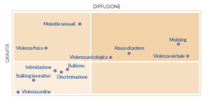 Un dato interessante riguarda la percezione della diffusione e della gravità delle diverse forme di violenza (Figura 2). In una recente ricerca condotta da WeWorld e Ipsos (Albini, Cerri e Castelli 2024), le molestie sessuali, pur essendo considerate la forma di violenza più grave dal 52% delle persone, sono percepite come poco diffuse (21%). Una sorte simile tocca alla violenza fisica (grave 34% e diffusa 10%). Questi dati, dunque, suggeriscono una consapevolezza elevata riguardo alle forme più gravi di violenza, ma allo stesso tempo un riconoscimento della loro rarità. Al contrario, il mobbing è percepito come molto diffuso (53%) ma meno grave (37%) e una tendenza simile si registra anche per le violenze verbali (56% diffuse, 28% gravi). In questo caso, appare evidente che, proprio perché diffusi e frequenti, mobbing e violenze verbali tendono a essere ritenuti “normali”, quasi “endemici” ad ogni rapporto o luogo di lavoro – e, di conseguenza, ne viene sottostimata la gravità.